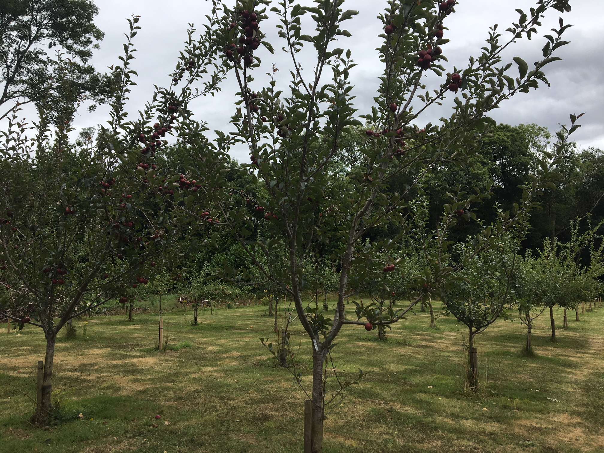 The trees are open-centred bush trees grafted on MM106 rootstock. There are three trees of each variety; some were rather hard to find, which is why the orchard has taken some time to establish. Recently we have been able to collect apples from the orchard and are hoping to be able to use the apples to produce an Enys apple juice in the future.