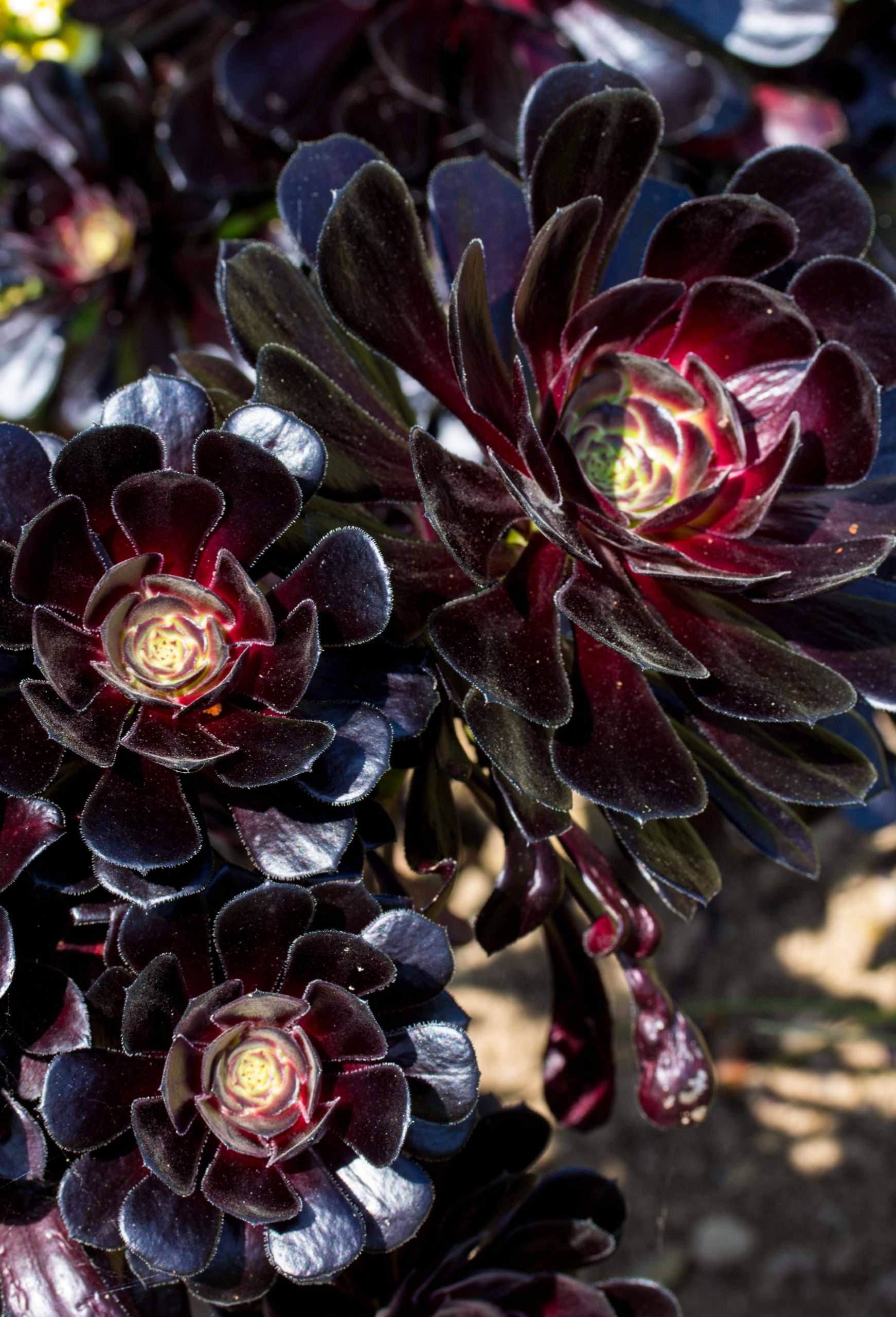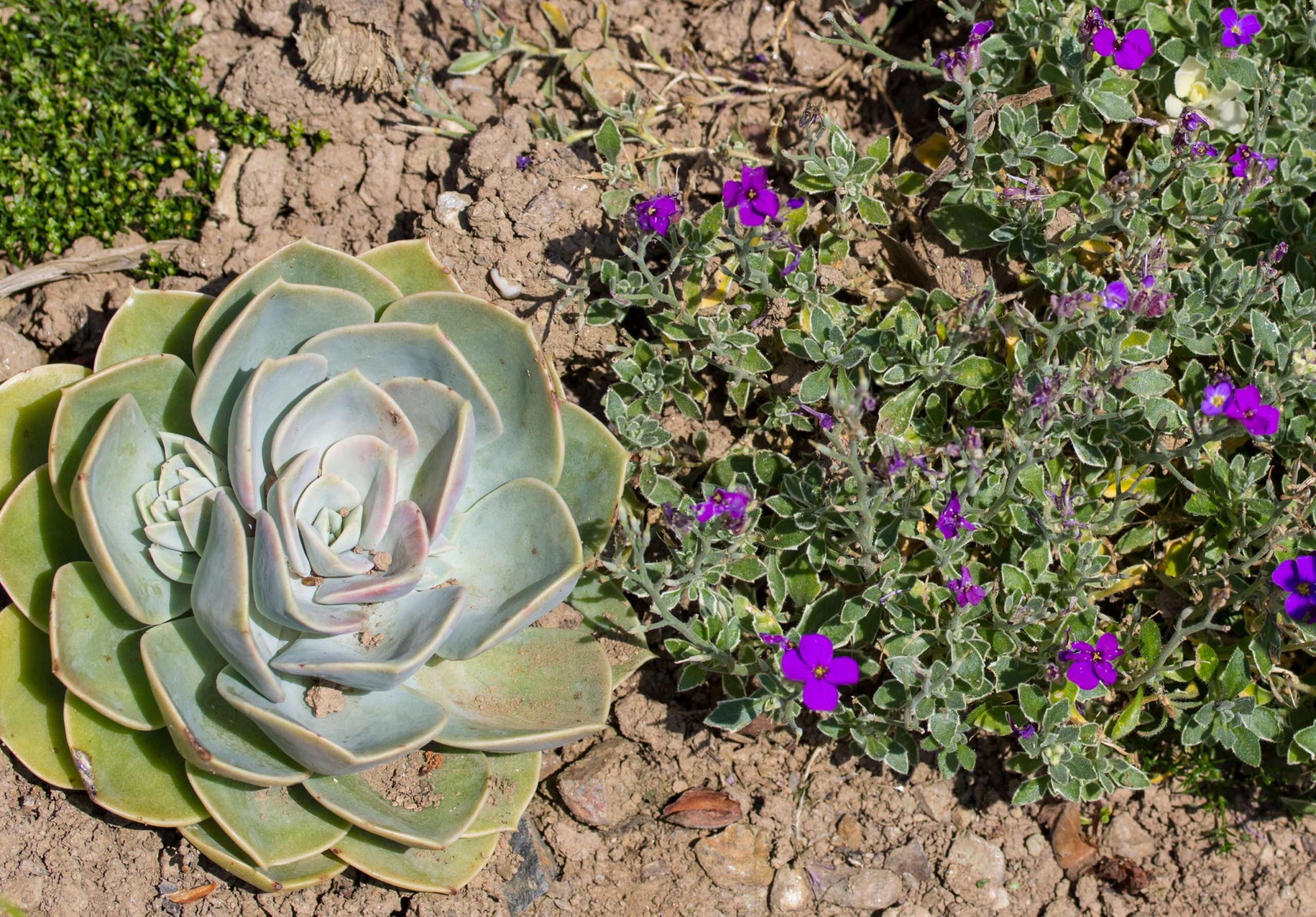 The dry south-facing border, located between the House and the old tennis court, is mostly focused on texture and form, with a large collection of succulents and architectural plants such as Trachycarpus fortuneii, Chamaerops humilis and Phormium.